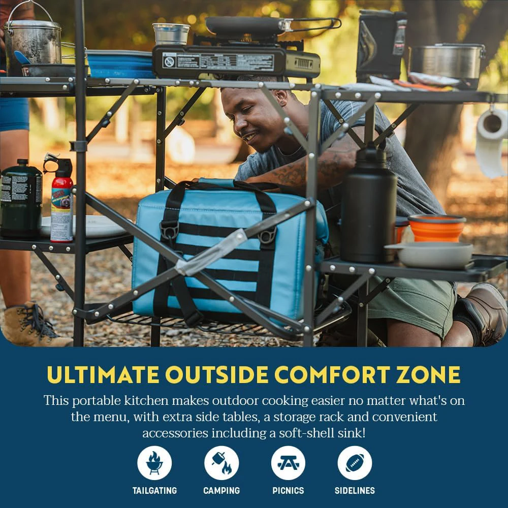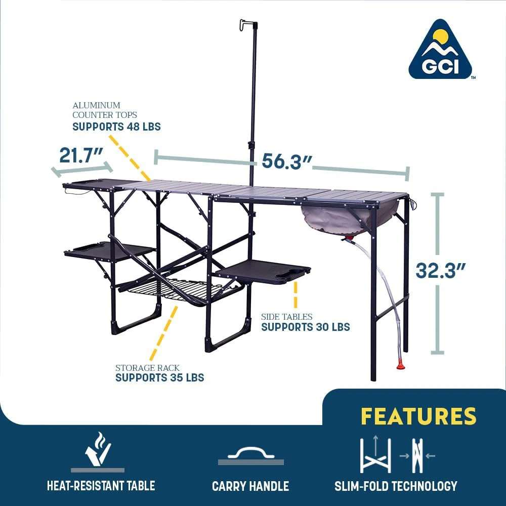 Tavolo da campeggio in alluminio pieghevole portatile, rendi i viaggi in campo epici con la stazione di cottura Master da GCI Outdoor. Questa cucina portatile è piena di caratteristiche (incluso un lavello a guscio morbido!), Rendendola l'aggiunta perfetta al tailgating o al campeggio.