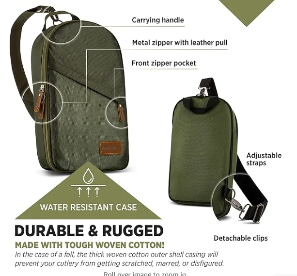 Borsa per utensili da campeggio esterno portatile. Ha più scomparti, quindi le posate rimane robuste e non ruttono durante il trasporto. Nel caso di una caduta, l'involucro esterno di cotone intrecciato impedirà alle posate di essere graffiate, rovinate o sfigurate ... Zhejiang Jiayu Outdoor Products Co., Ltd.Picnic, escursioni e campeggio. Piegato, la custodia si adatta comodamente al bagaglio da viaggio, al tronco o può essere tenuta a mano (maniglia integrata). Lavastoviglie sicuro e pulisce facilmente ed è amichevole. Ingegnerizzato con un design elegante, memorizza facilmente negli spazi di stoccaggio standard