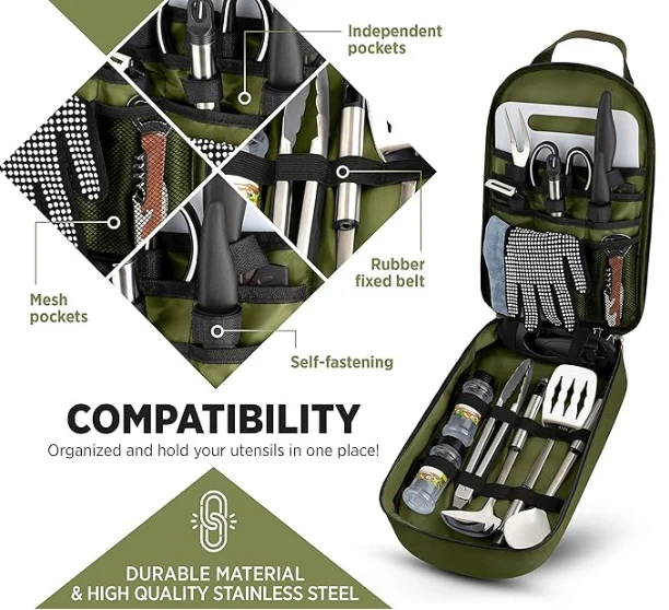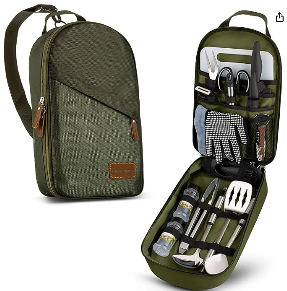 Borsa per utensili da campeggio esterno portatile, ogni utensile ha la sua custodia designata, quindi le unità non vengono imbrattate, graffiate o danneggiate in deposito o in transito. Fornisce un facile accesso ai tuoi utensili di cottura ed è dotato di una cerniera a zip sicura